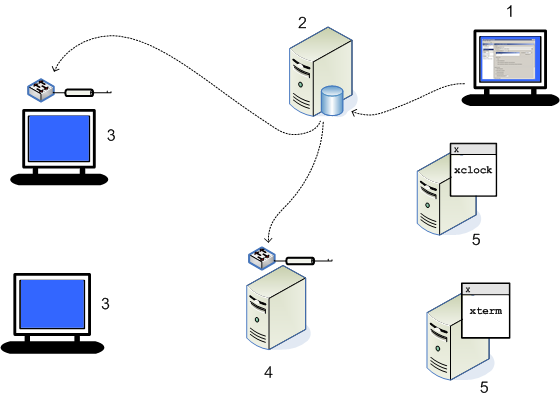 管理者は管理コンソール (1) を使用してドメインコントローラ (2) を構成します。ユーザがセッションを開始すると、ドメインコントローラがユーザワークステーション (3) またはドメインノード (4) にセッションコンポーネントを設定できます。