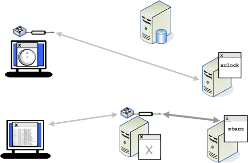 一元管理された構成を使用して、ユーザワークステーション上に X サーバディスプレイが作成されます。