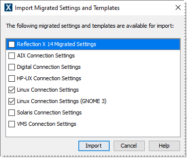 The first time you run X Manager, the Import Migrated Settings and Templates dialog box opens. This dialog box includes a list of sample connection settings for different host types. Migrated settings are also listed if you are running on a system with local settings used by legacy Reflection X products, or Hummingbird Exceed.