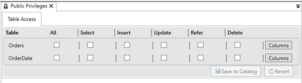 For each table instance, select the appropriate tick-boxes, or leave the tick-boxes clear so that the privilege is governed