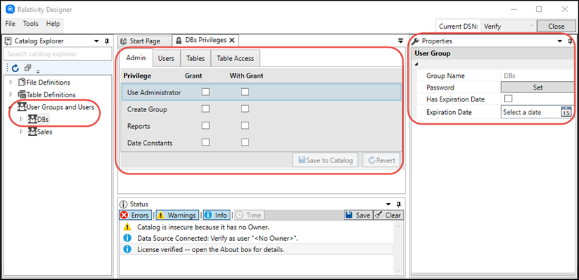 To access a group's privileges, in the Catalog Explorer, expand User Groups and Users, and then double-click the required group. Note, you cannot access or edit the privileges for the Owner group as that group automatically has maximum privileges assigned.