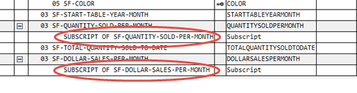 In this example, neither of the highlighted items should be moved to a table and still have that table be writable. The subscript items do not really exist in the underlying COBOL data file. If you need to view subscript items, consider creating a table for retrieving data and a separate table for writing. The separate table for writing must not include any repeating data items with unbound subscripts.