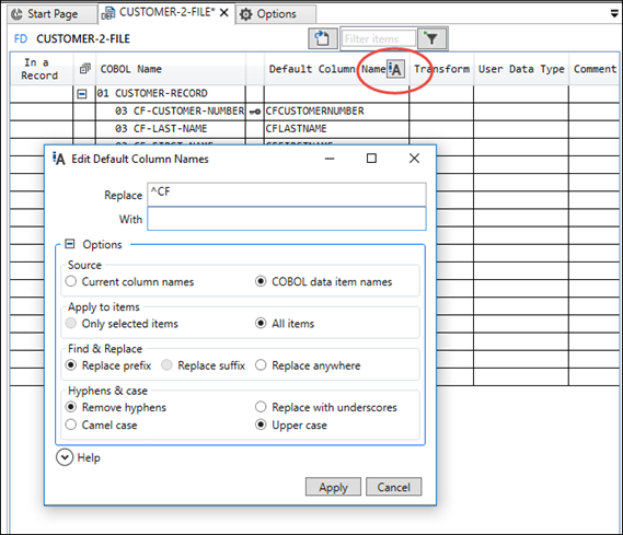 In Relativity, each data item defined in a file definition (FD) has a default SQL column name based on its COBOL data-name. Most COBOL programs have a data-name for a data item that reflects COBOL coding standards meant to communicate information to the programmer. SQL column names, however, must communicate meaning to the end-user.