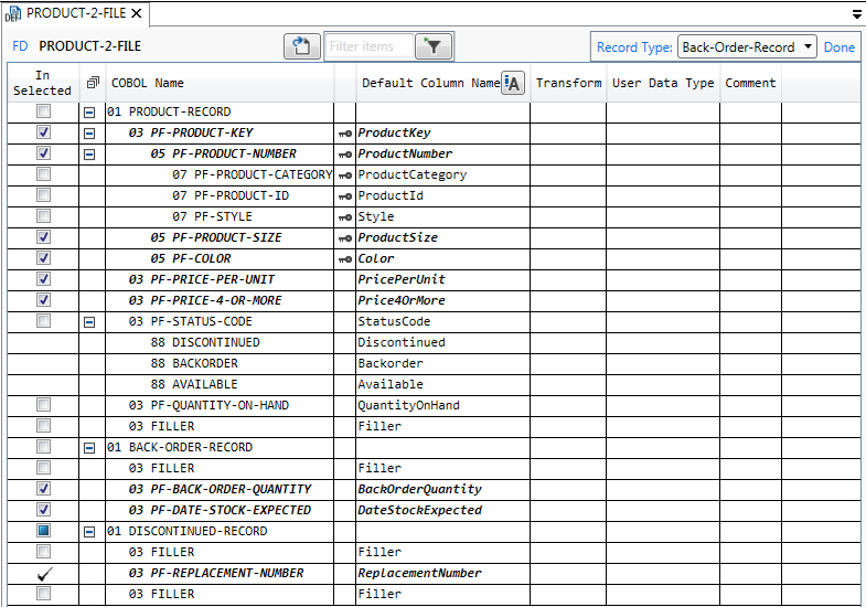 This example shows multiple 01-level items (PRODUCT-RECORD, BACK-ORDER-RECORD and DISCONTINUED-RECORD) included in the same record type (BACK-ORDER-RECORD). A table that contained this record type could not be written to unless all of the columns are derived from items belonging to a single 01 level item. That is, all must belong to PRODUCT-RECORD, all must belong to BACK-ORDER-RECORD, or all must belong to DISCONTINUED-RECORD. This is the only way that the correct 01 level can be selected for the COBOL WRITE or REWRITE. A simple rule to follow for writable tables is to define a record type for each level 01.