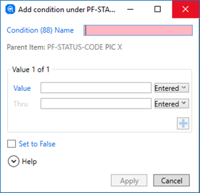 For alphanumeric types, the value can also be one of the standard COBOL literals or a hexadecimal representation: click Entered and select the appropriate value type. See entered numerics and hexadecimal condition values for more information.