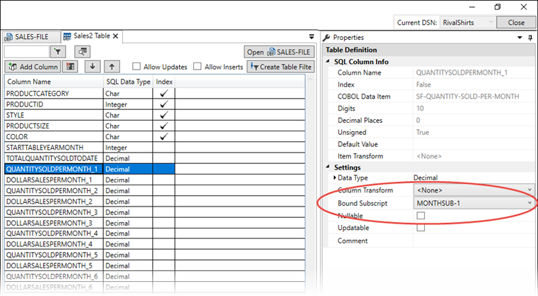 Tip: If the column derived from the data item containing the OCCURS is already defined, remove it: select the column name, click
