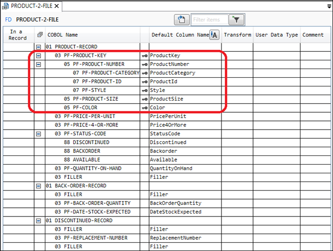 In this example, the data items, the following highlighted items make up the primary key. All of these data items should be accounted for in any tables that will allow write operations. They may be accounted for as a column, as part of the record type filter, or as part of the table filter.