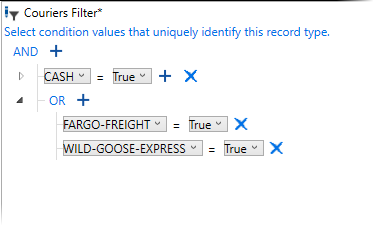 The following example shows a filter with two factors: one factor contains a single condition (CASH = True) and the other factor is an OR list that contains two conditions (FARGO-FREIGHT = True and WILD-GOOSE-EXPRESS = True). Both factors must evaluate TRUE for the record to be used in the record type: that is, CASH must evaluate to TRUE, and either FARGO-FREIGHT or WILD-GOOSE-EXPRESS must evaluate TRUE.