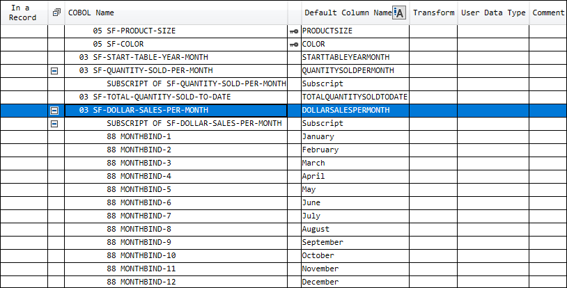 This example shows how all of an item's subscripts can be bound. The data item, SF-DOLLAR-SALES-PER-MONTH, has condition-names set for each value that the subscript can contain. In this case the values are 1 through 12. See Defining Columns on Repeating Data Items for more details on how subscripts are bound.