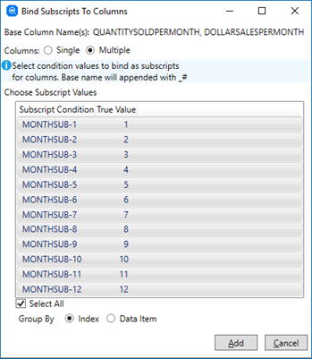 Add Column, select a subscripted data item that contains subscript conditions (see