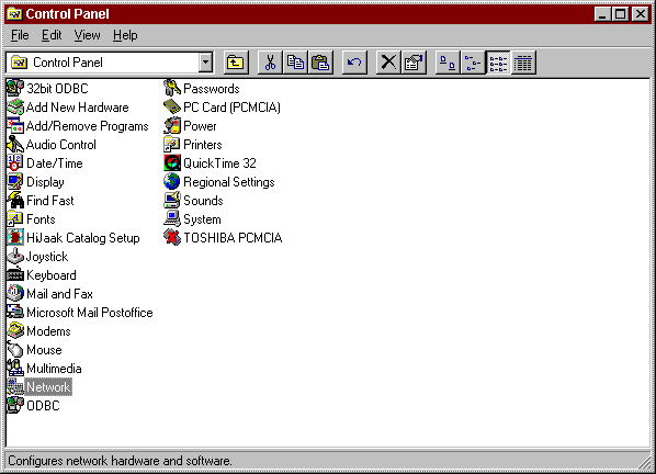 Select Start from the Taskbar, then Settings, then Control Panel. Once the Control Panel is displayed, select the Network Icon by double-clicking.