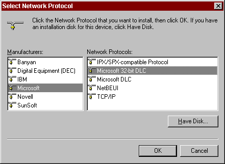The DLC driver that was released with Windows '95 is a 16-bit driver. You will need to obtain the 32-bit DLC driver for Windows '95 from Microsoft. This can be done by accessing the Microsoft web site and searching for the file named MSDLC32.EXE. After downloading the file create a diskette and extract the contents by running MSDLC32.EXE. This file is a self-extracting zip file. This diskette can then be used to add a protocol. You will need to have your original Windows '95 CD or diskettes available during the installation as the DLC protocol will require additional operating system support files to be loaded. To do this, follow the steps below.