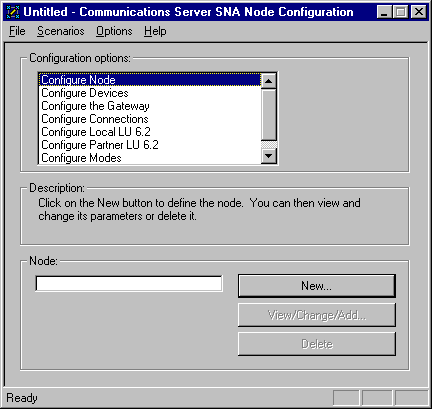 From the IBM Communications Server program folder, start the SNA Node Configuration program.