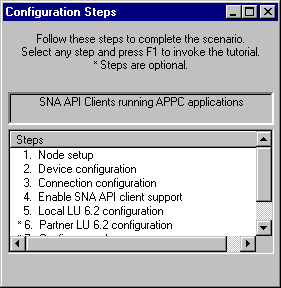 The Configuration Steps window describes the configuration steps you will complete. Note that for CCIAPPC configuration step 7. Configure Modes is optional and that step 8. Transaction program configuration is not required.