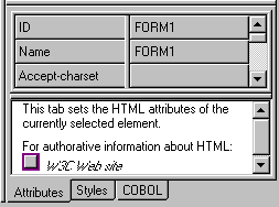Properties are grouped onto different panes, selected by clicking the tabs at the bottom. The Attributes pane displays the HTML attributes and the Styles pane displays its CSS style settings. If a form or form element is selected, the COBOL pane enables you to set properties for linked data items (see Properties and Linked Data Items). If you select a Java applet or ActiveX control, a Properties pane enables you set any exposed properties.
