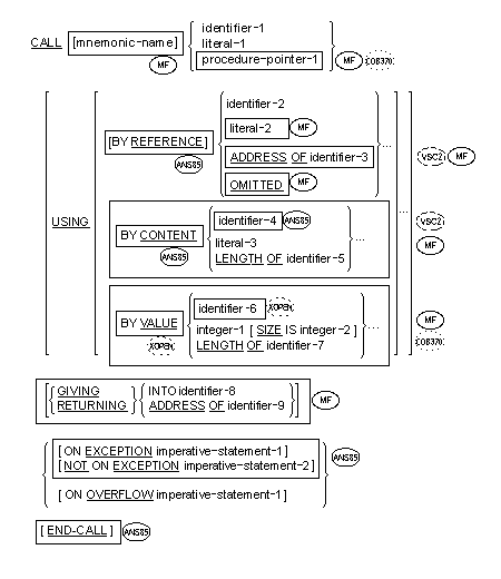 Syntax rules marked with an asterisk (*) are common to the CALL statement and to the CHAIN statement. In these rules, where "CALL or CHAIN statement" is specified, you should read "CALL statement" or "CHAIN statement" when applying the rules to the CALL statement or the CHAIN statement respectively.