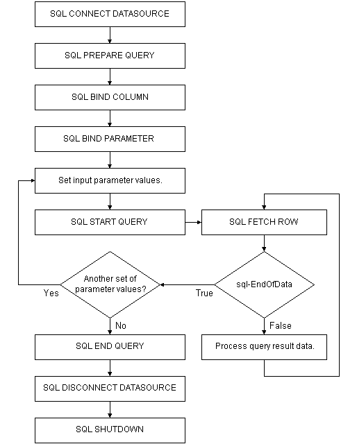 This flow chart shows the typical pattern for a single advanced query using InstantSQL. Error handling is not shown in order to simplify the flow chart. An application should check for errors following each InstantSQL statement as shown in the status inquiry flow charts.