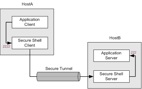 In the configuration shown above, the application client and the Secure Shell client both run on HostA. The Secure Shell server and application server both run on HostB. All data sent to port 2222 on HostA is forwarded to port 222 on HostB. In this arrangement, all data in transit is securely encrypted. The following command (in which localhost identifies the loopback address on HostB) configures this: