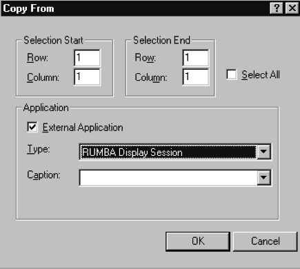 You can use Copy From and Paste To commands in the Macro Editor to designate an area of a display screen to be copied from one application and pasted into another application. To do this, you need to specify the application and the location (in terms of rows and columns) from which the data should be copied, and the application and location to which it should be pasted.
