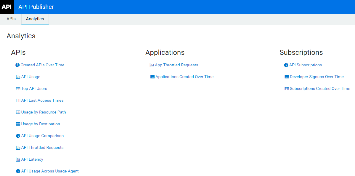 You can view detailed reports generated by the Analytics component in the Publisher. The Publisher divides the reports into three categories: APIs, Applications, and Subscriptions.