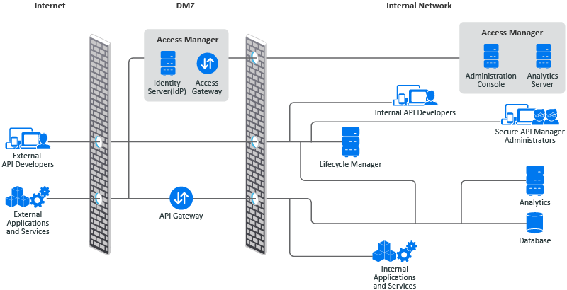 To cluster components, use an L4 switch. Clustering provides redundancy, high availability, and load balancing. We also recommend that you place the L4 switch for the API Gateway and Lifecycle Manager in the DMZ to allow external applications, services, and API developers access to Secure API Manager. You must ensure that the API Gateway component or the L4 switch for the API Gateway component can communicate with the Identity Provider in Access Manager. You must also ensure that API developers can communicate with the Lifecycle Manager.