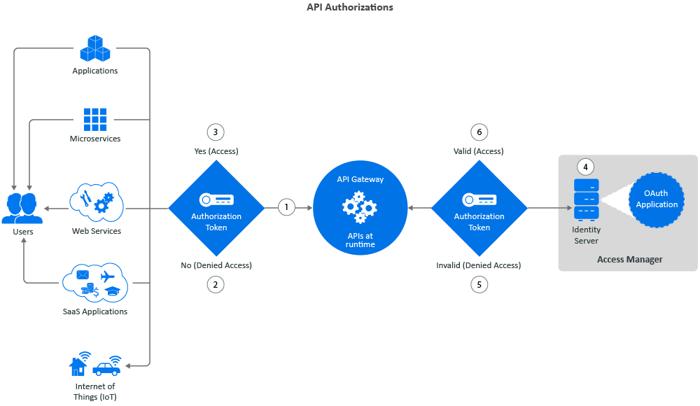 Secure API Manager controls access to APIs through OAuth authorizations. When you configure Secure API Manager, it automatically creates an OAuth 2 application for you in Access Manager. Secure API Manager uses the authorizations tokens from this OAuth 2 application to secure access to the APIs. When an API developer creates an API in the Publisher, the developer adds the authorization token to the API from this OAuth 2 application. The following graphic shows the flow of the API authorization from the application, service or item through the API Gateway to the Access Manager Identity Server.