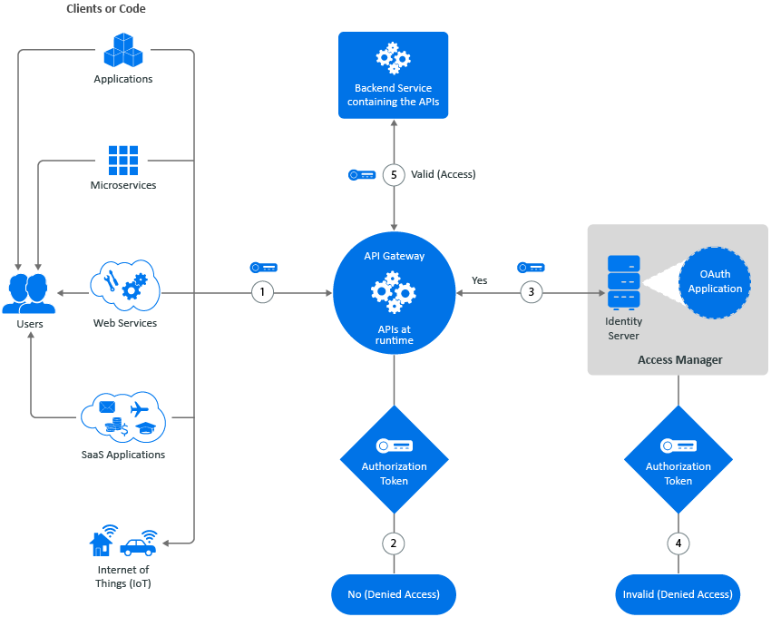 Secure API Manager controls access to APIs through OAuth authorizations. When you configure Secure API Manager, it automatically creates an OAuth 2 application for you in Access Manager. Secure API Manager uses the authorizations tokens from this OAuth 2 application to secure access to the APIs. When an API developer creates an API in the Publisher, the developer adds the authorization token to the API from this OAuth 2 application. The following graphic shows the flow of the API authorization from the application, service, or item through the API Gateway to the Access Manager Identity Server.