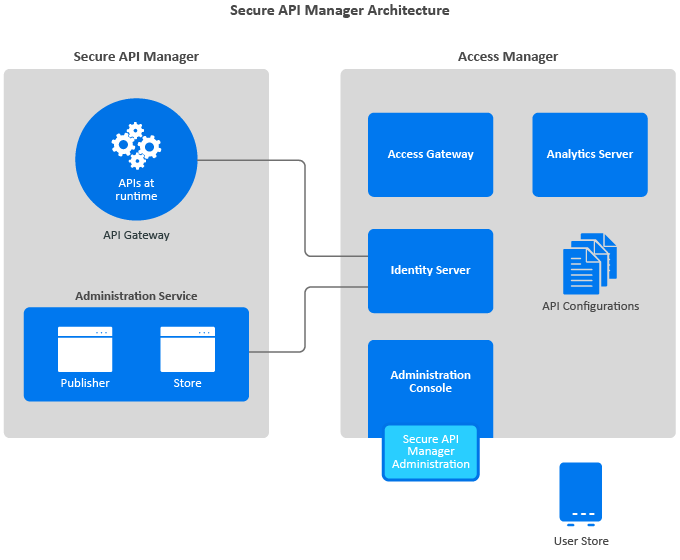 Secure API Manager consists of one appliance or a Docker container that you deploy that integrates closely with Access Manager to provide all of the functionality required to manage and control access to the APIs.