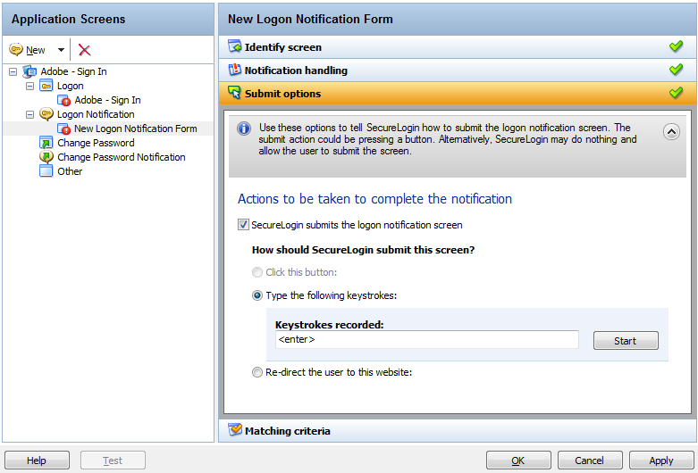 Type the following keystrokes: Define the commands or keystrokes that SecureLogin enters to submit the login screen.