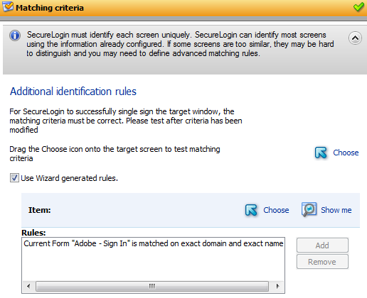 By default, Use Wizard generated rules is selected. The Rules text box lists the controls that are detected by SecureLogin. You can add new rule by dragging the Choose