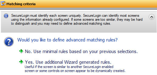 If you select No. Use minimal rules based on your previous selections, SecureLogin uses the rules defined in previous attribute panels to identify and handle an application.