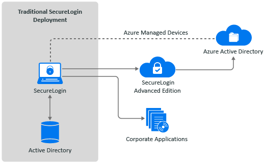 SecureLogin Advanced Edition, hereinafter called the Advanced Edition, is a new SecureLogin server introduced to use Azure Active Directory (Azure AD) as an identity provider. As organizations are moving towards cloud-based identity providers, Advanced Edition is developed to support Azure AD. Advanced Edition will also be capable of supporting other cloud-based identity providers in the future. Using Advanced Edition, you can seamlessly migrate from an Active Directory environment to an Azure AD environment.