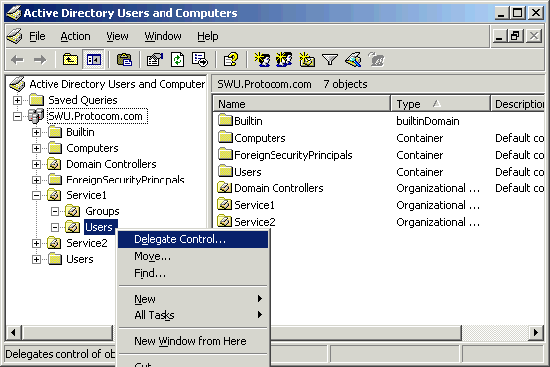 On a workstation or server, open Active Directory User and Computers (dsa.msc), and browse to the OU where you would like to create the group that will manage SecureLogin for the selected container and its children.