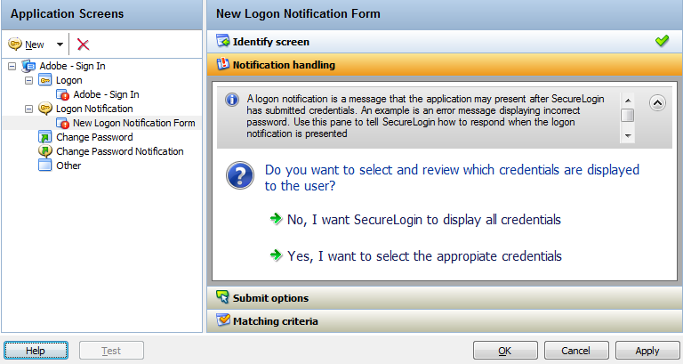 A login notification is a message that the application displays after SecureLogin has submitted the credentials, such as an error message indicating an incorrect password. Use the Logon Notification options to define how SecureLogin handles notifications in your application definition.