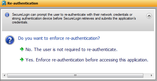 If you select No. The user is not required to re-authenticate, SecureLogin does not prompt users to re-authenticate before providing the credentials to the application.