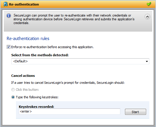 Type the following keystrokes: Define the commands or keystrokes that SecureLogin enters when a user clicks Cancel on the re-authentication dialog box. To record keystrokes: