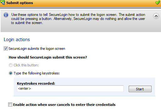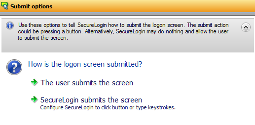 Use the Submit options menu to define how SecureLogin submits the login screen.