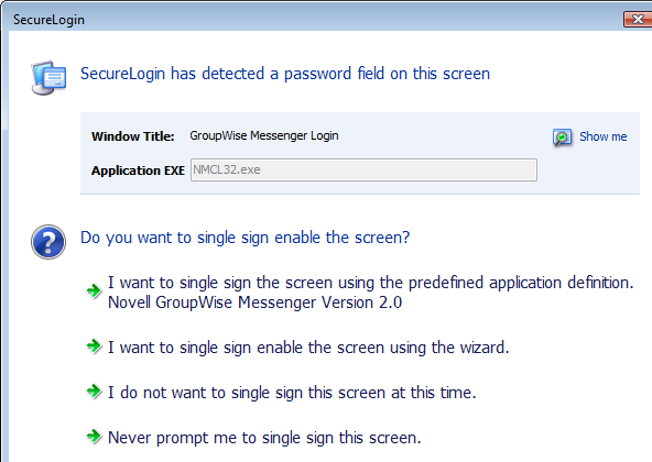 Select I want to single sign the screen using the predefined application definition. Novell GroupWise Messenger Version 2.0.