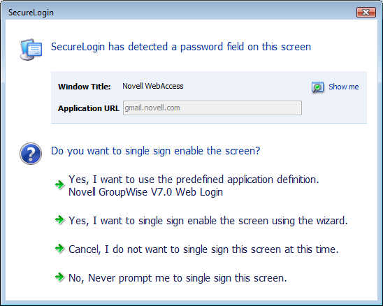 A predefined application definition exists for Novell WebAccess. SecureLogin detects the application and the SecureLogin dialog box is displayed.