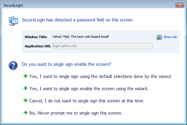 SecureLogin detects the application and prompts you to enable the screen for single sign-on.