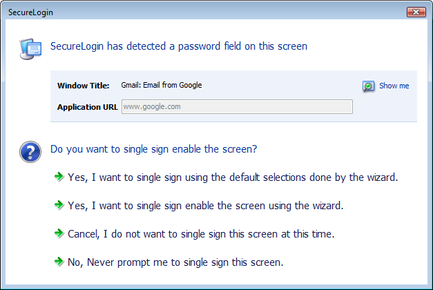 When SecureLogin detects a typical, simple login screen containing a username field, password field, and a submit button, it displays the following prompt: