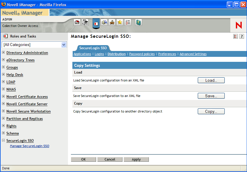 The Load and Save dialog boxes help the administrator to import and export the SecureLogin configurations. For more information, see Copying a Configuration Across Organizational Units
