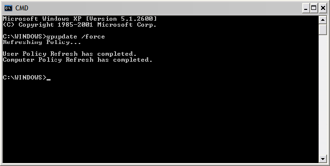 If your GPO refresh has not occurred, you can manually force the update by going to a command line and issuing the gpupdate /force command (Windows XP). You should see results similar to the following: