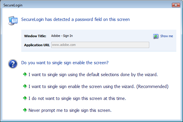 The SecureLogin advanced Web Wizard makes it easier for users to enable single sign-on (SSO) websites and capture a user’s web-based login details. When the user accesses a web page from the browser, SecureLogin automatically launches the Web Wizard.