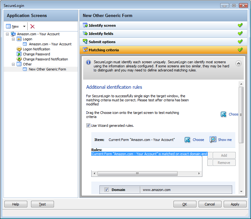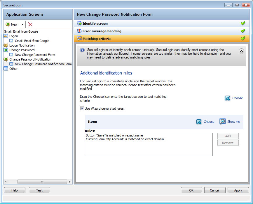 By default, Use Wizard generated rules is selected. The Rules text box lists the controls detected by SecureLogin. You can add a new rule by dragging the Choose
