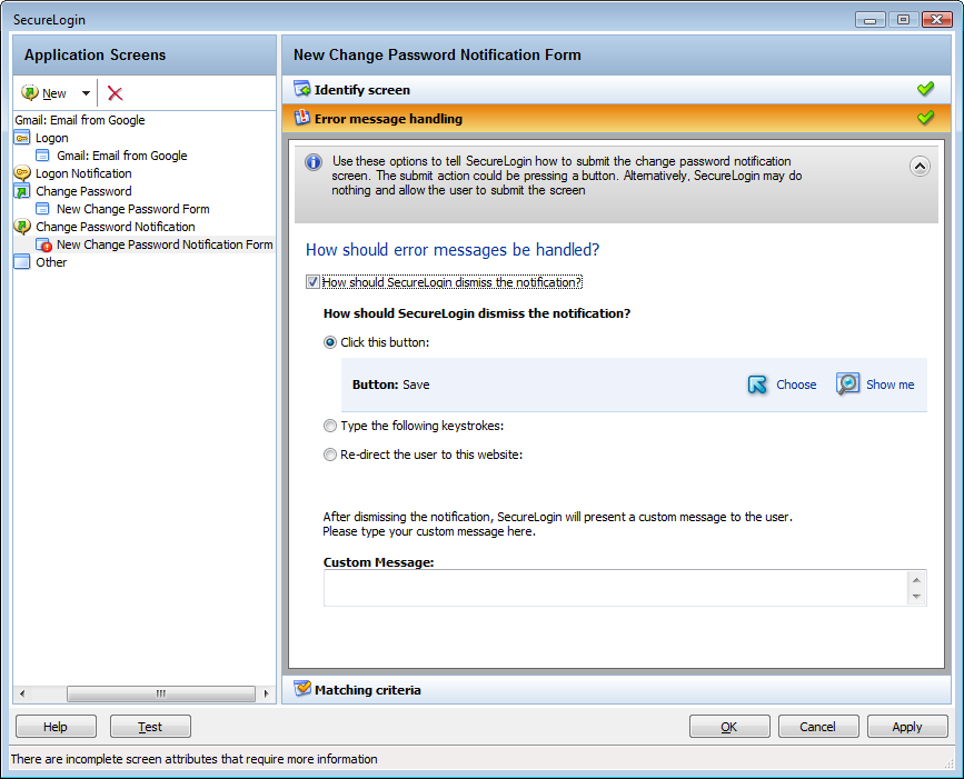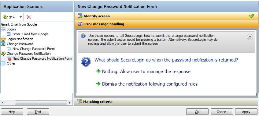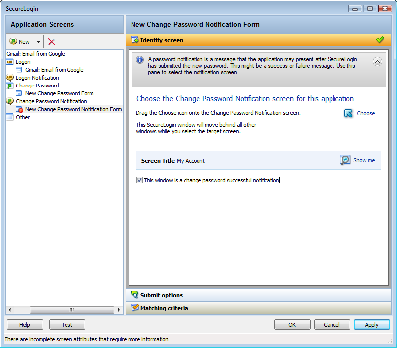 SecureLogin must uniquely identify the change password notification screen to handle the notification. You can the Identify screen attribute to select or change the notification screen.