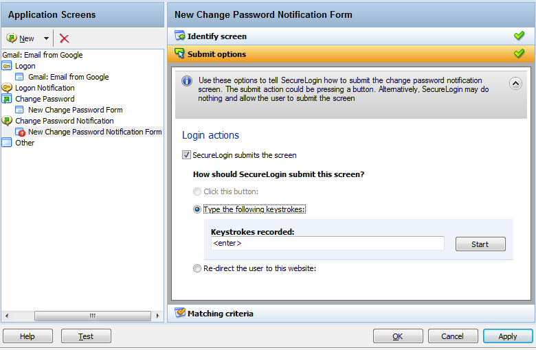 Type the following keystrokes: Define the commands or keystrokes that SecureLogin enters to submit the change password screen.