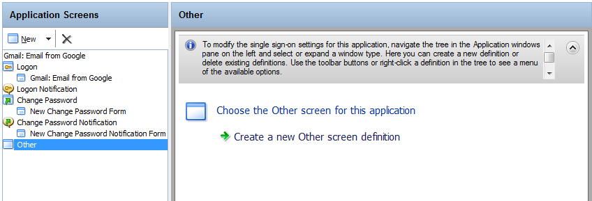 The Applications Screens pane has a list of the application forms enabled for single sign-on, change password, notifications, and others.