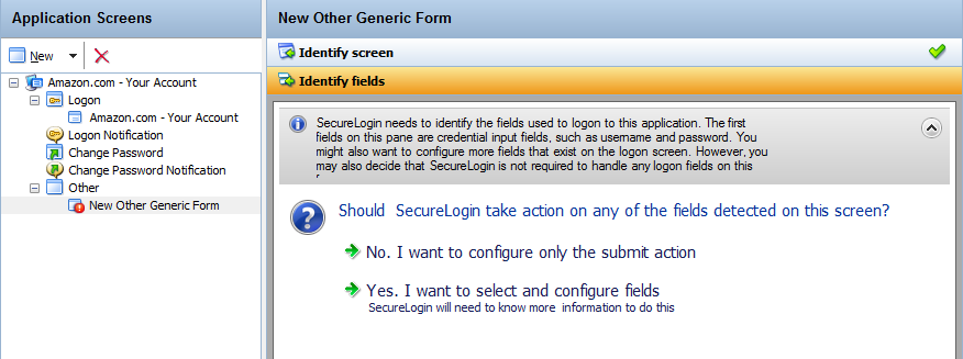 If you select No. SecureLogin is not required to handle the fields on this screen, SecureLogin does not handle any fields detected on the application. Use this option to create a common credential set that you can use with several applications. You can link other application definitions to this common credential set.