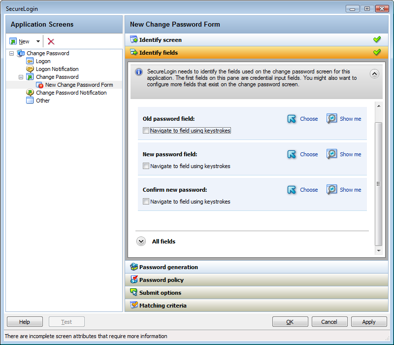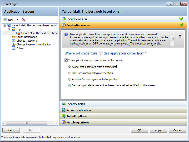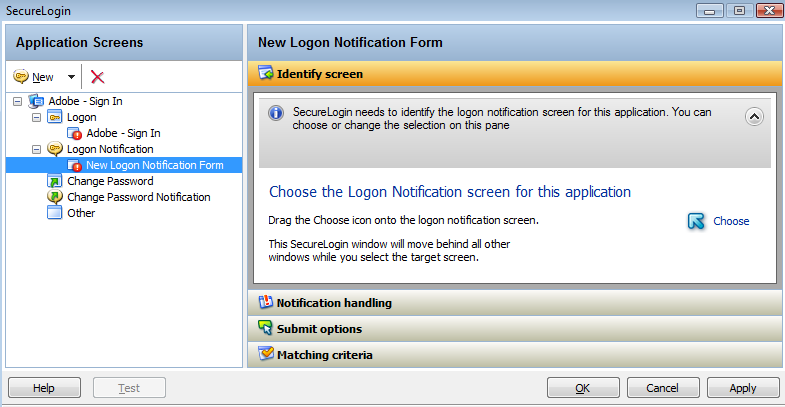 SecureLogin identifies the login screen of the application for which you want to enable single sign-on. You can use the Identify screen attribute to select or change the login screen of the application.